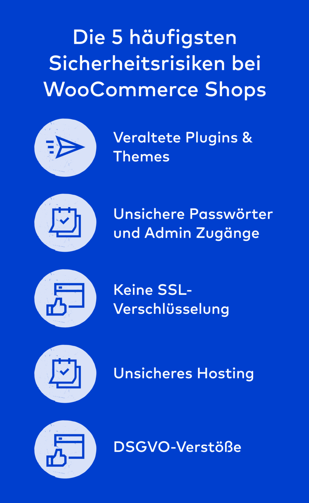 - Veraltete Plugins, schwache Passwörter oder fehlende Verschlüsselung zählen zu den größten Risiken für deinen WooCommerce Shop.